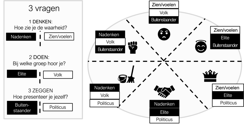 Onder al die unieke presentaties ligt echter ook een logica. Want bij een bepaalde politieke inhoud – links, midden, rechts – past niet elke politieke stijl. Politici hebben veel stijlvrijheid, maar niet onbeperkt want sommige stijlen spreken je politieke boodschap tegen. Als Hugo de Jonge bijvoorbeeld een streng-gereformeerde, traditionele politieke boodschap had gehad, dan had hij die schoenen niet aangetrokken, want die drukken toch uit dat je af en toe eens uit de band moet springen. En Geert Wilders verft zijn haar blond en niet zwart – dat laatste had zijn politieke boodschap in de weg gezeten, want hij had er veel minder Nederlands door uitgezien. Het Archetypemodel is gebaseerd op de logica onder politieke taal. Daaruit vloeien zes logisch coherente politieke karakters of stijlen.